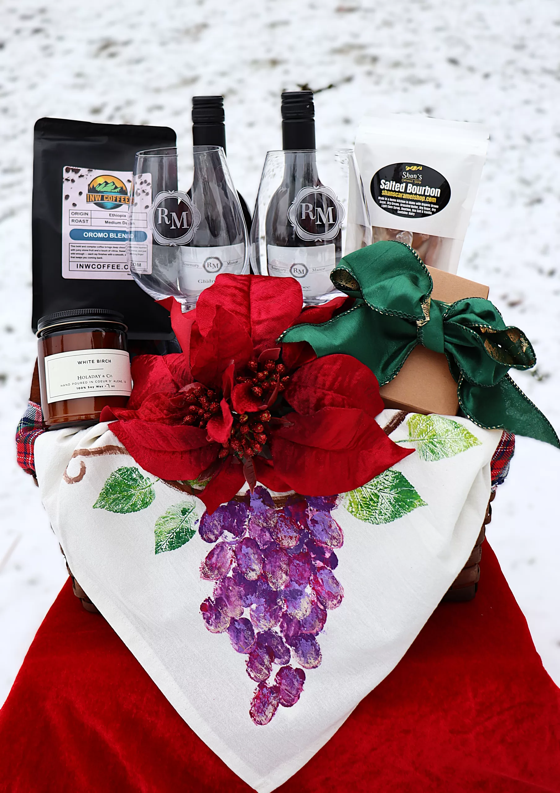 This beautiful and thoughtfully assembled Christmas wine basket is sure to bring all the cheer. We’ve paired our wine with local custom gifts and yummy goodies, packaged and delivered in a festive holiday basket. Whether you decide to gift, share or enjoy for yourself, this basket allows you to do it all…eat, drink & be merry.